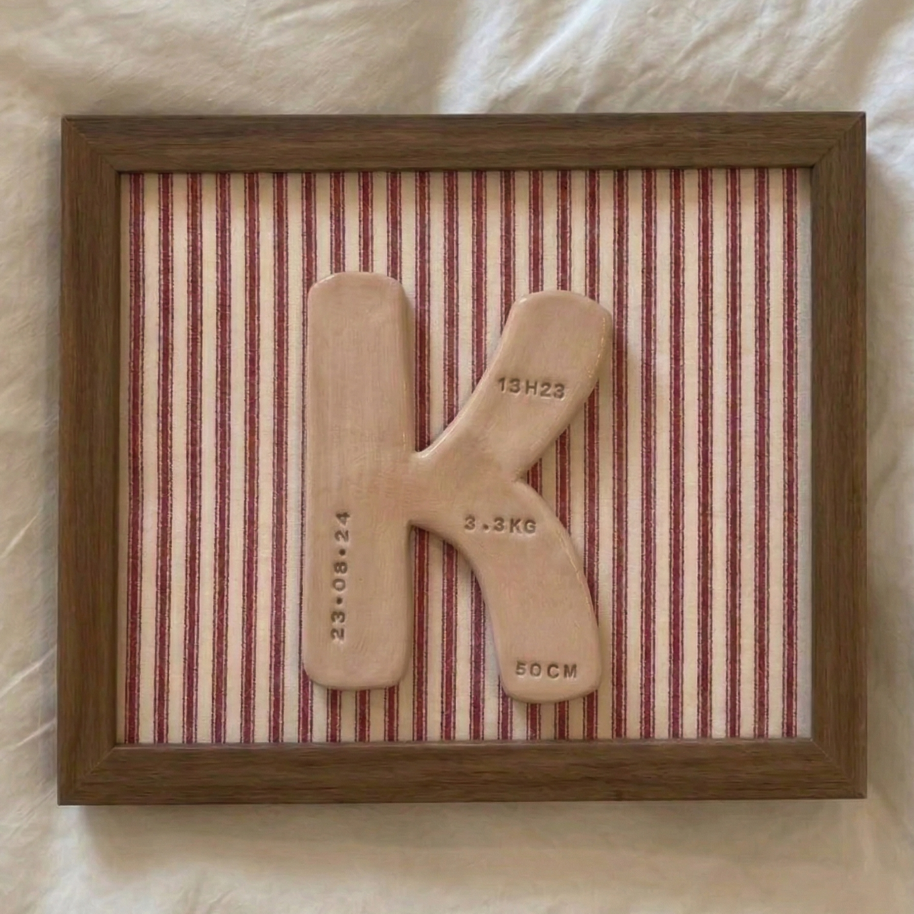 - La inicial de tu bebé con sus datos de nacimiento (peso, altura, fecha y hora). Incluye un elegante marco de madera natural (20x20 cm) para proteger la pieza y exhibirla.